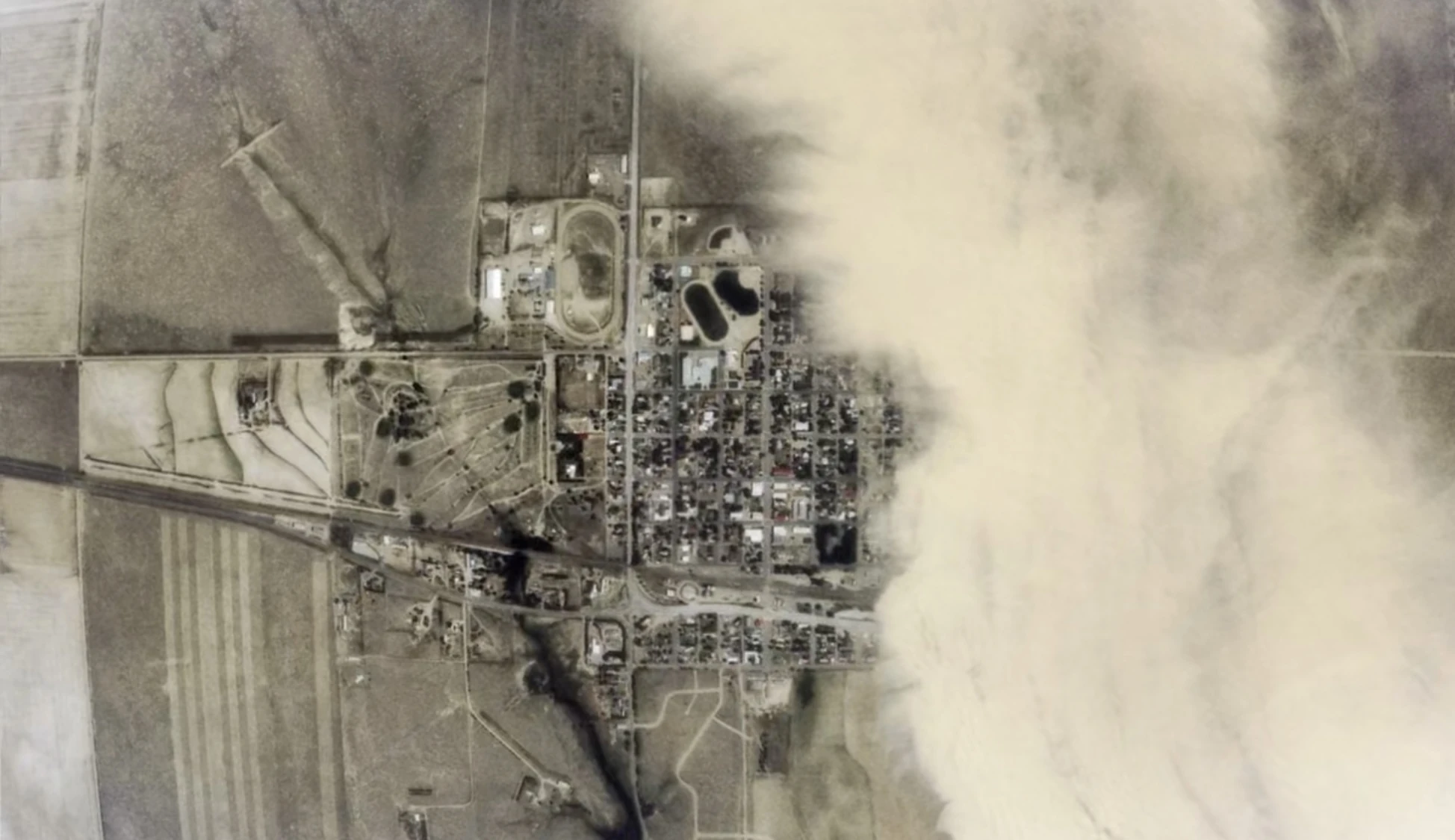 The town as seen from a satellite with the large dust storm being the Zombie Horde.